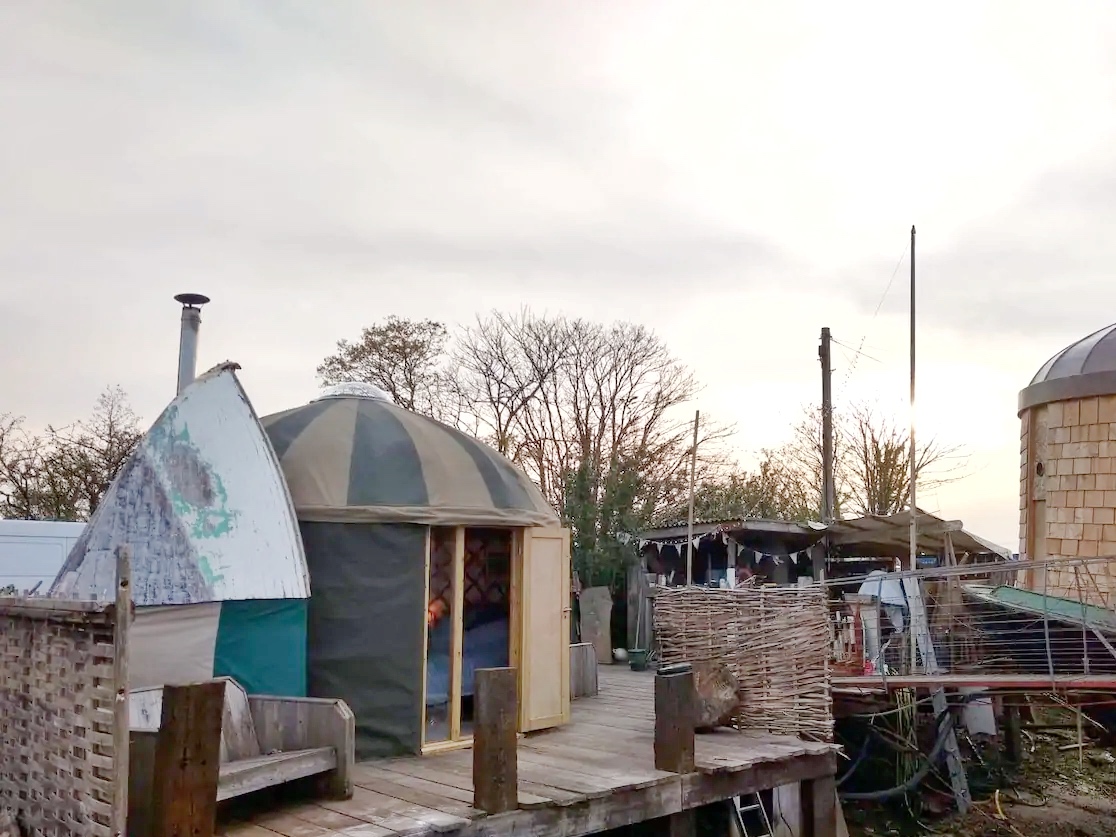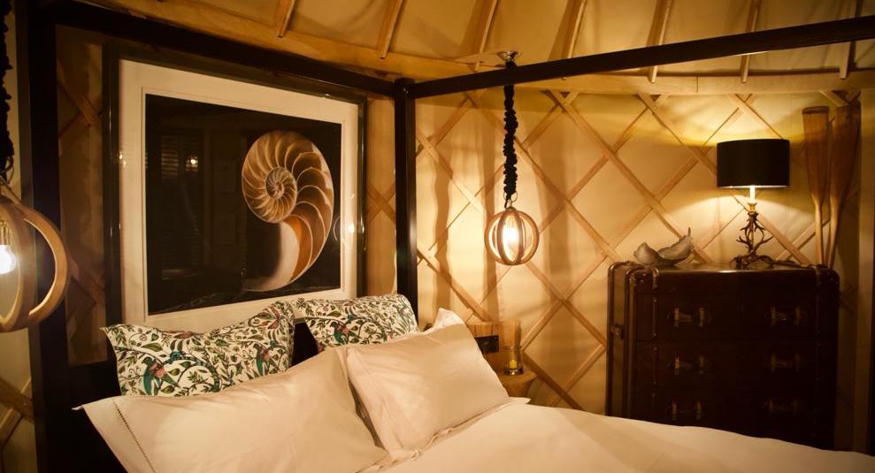 Perfect for couples this 4 metre Yurt is an oasis of quirk, with a wet-room shower made from the bow of a sailing boat, a “mauled” wood headboard and wonderful natural split wood bedside tables.